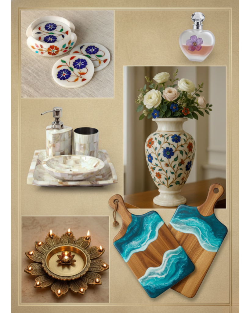 Wood and Resin Art pieces are handcrafted décor products made from premium natural wood and high-quality resin, known for their unique designs, durability, and suitability for premium interior and gifting applications worldwide.